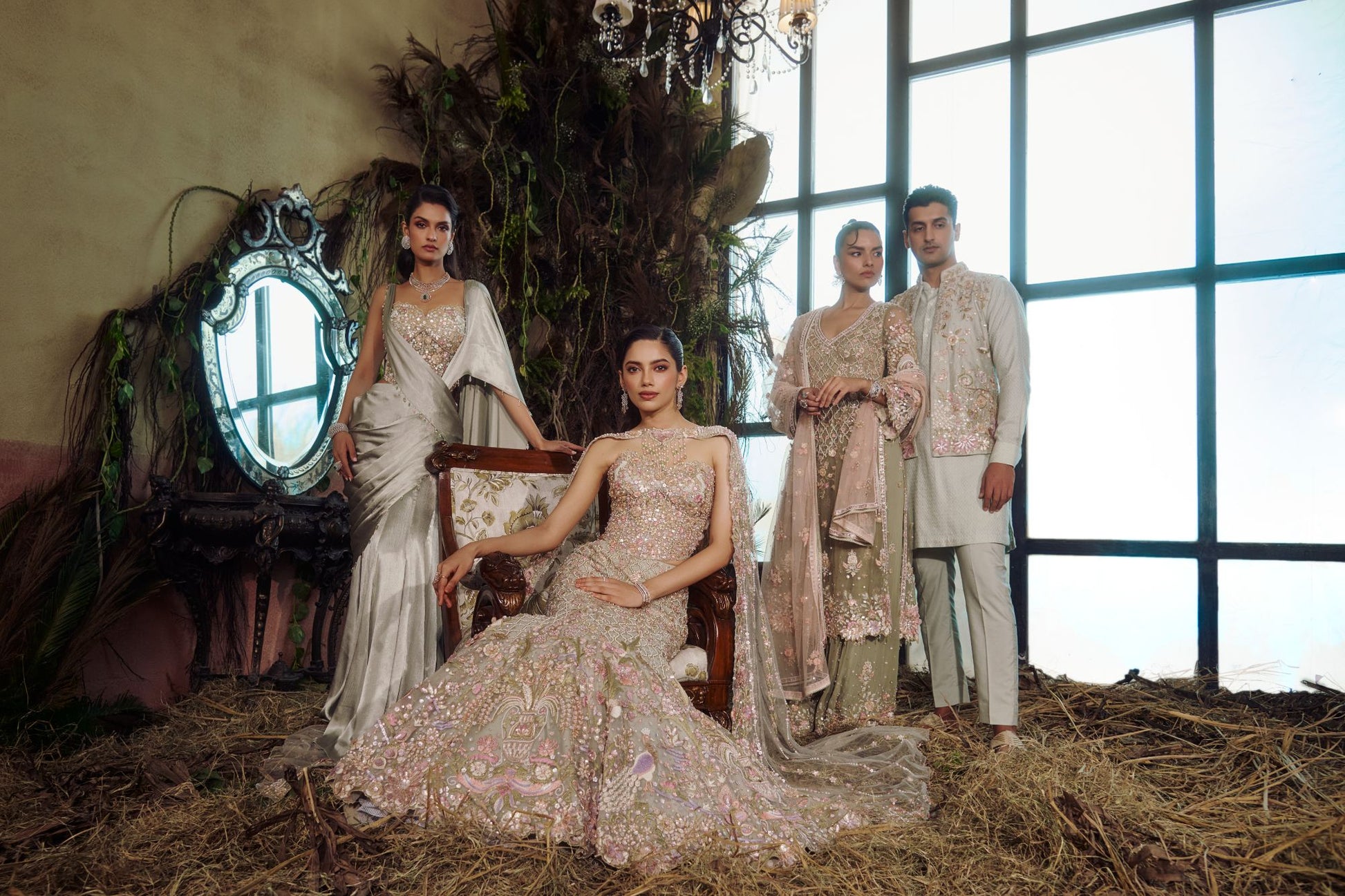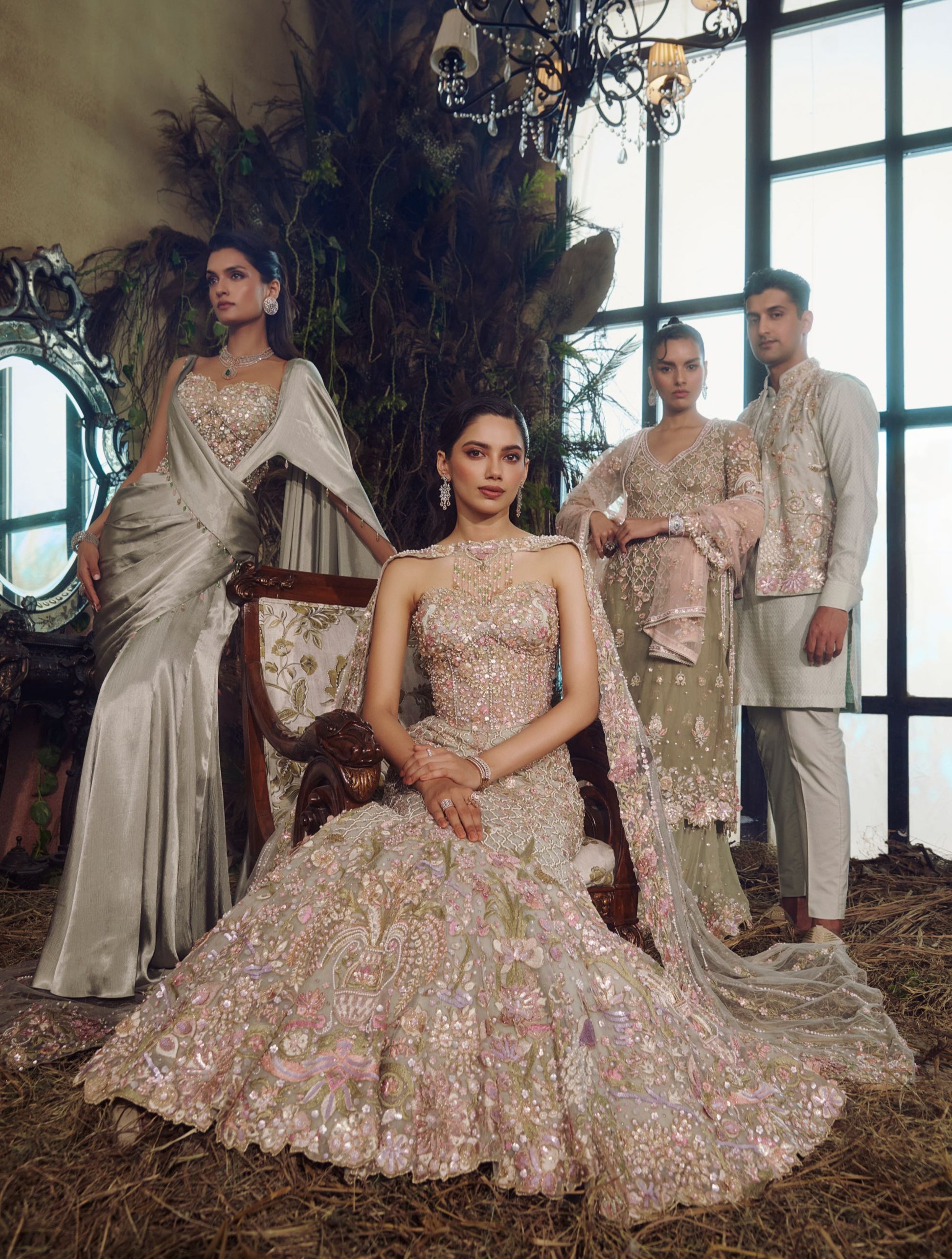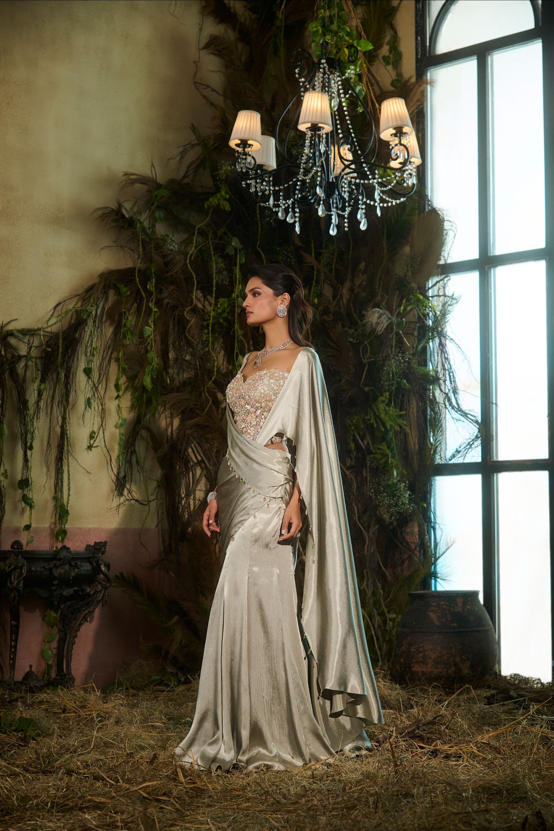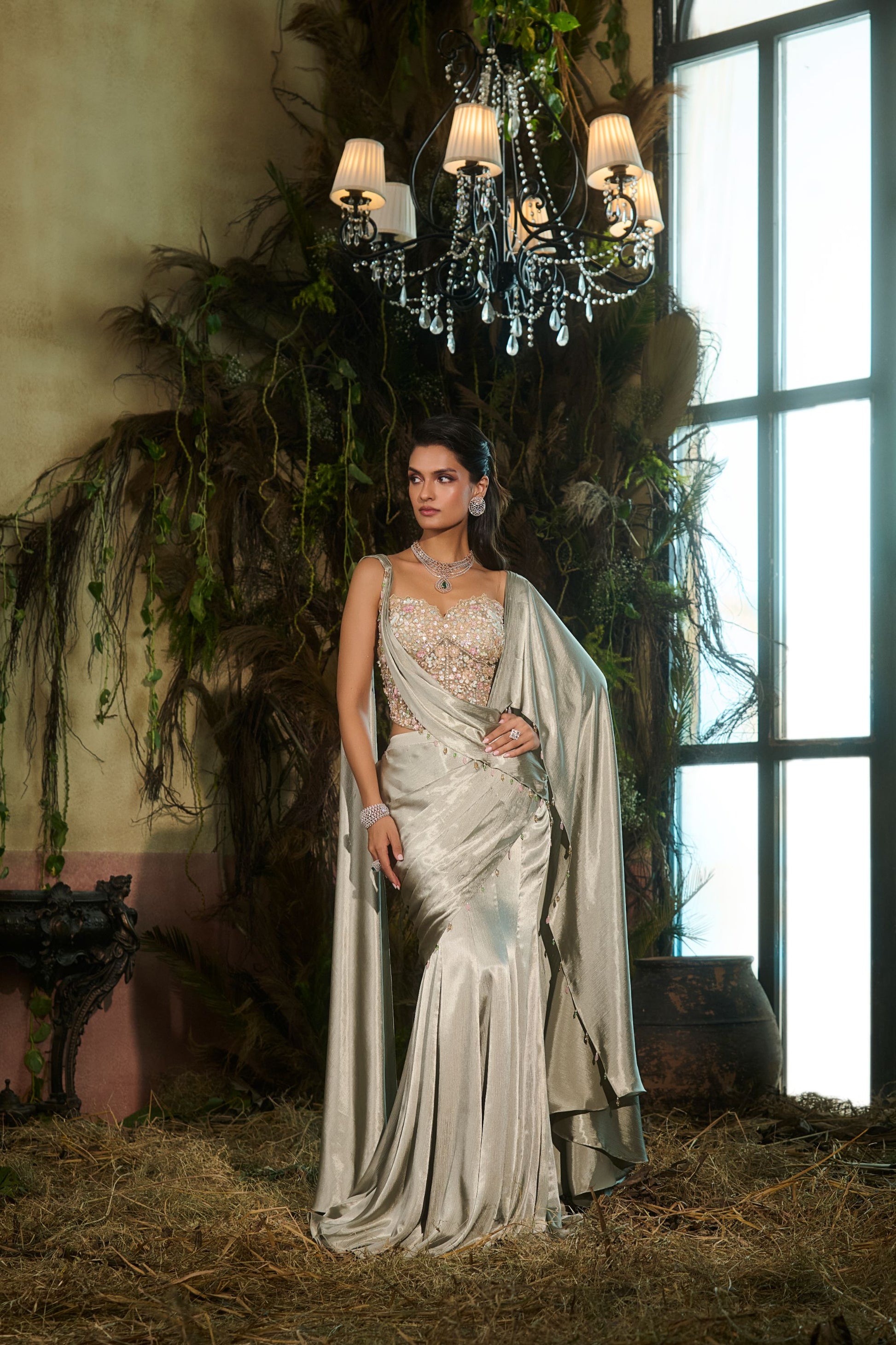 Floral embroidered corset with Resham, sequins, pearls paired with draped saree in mint satin.