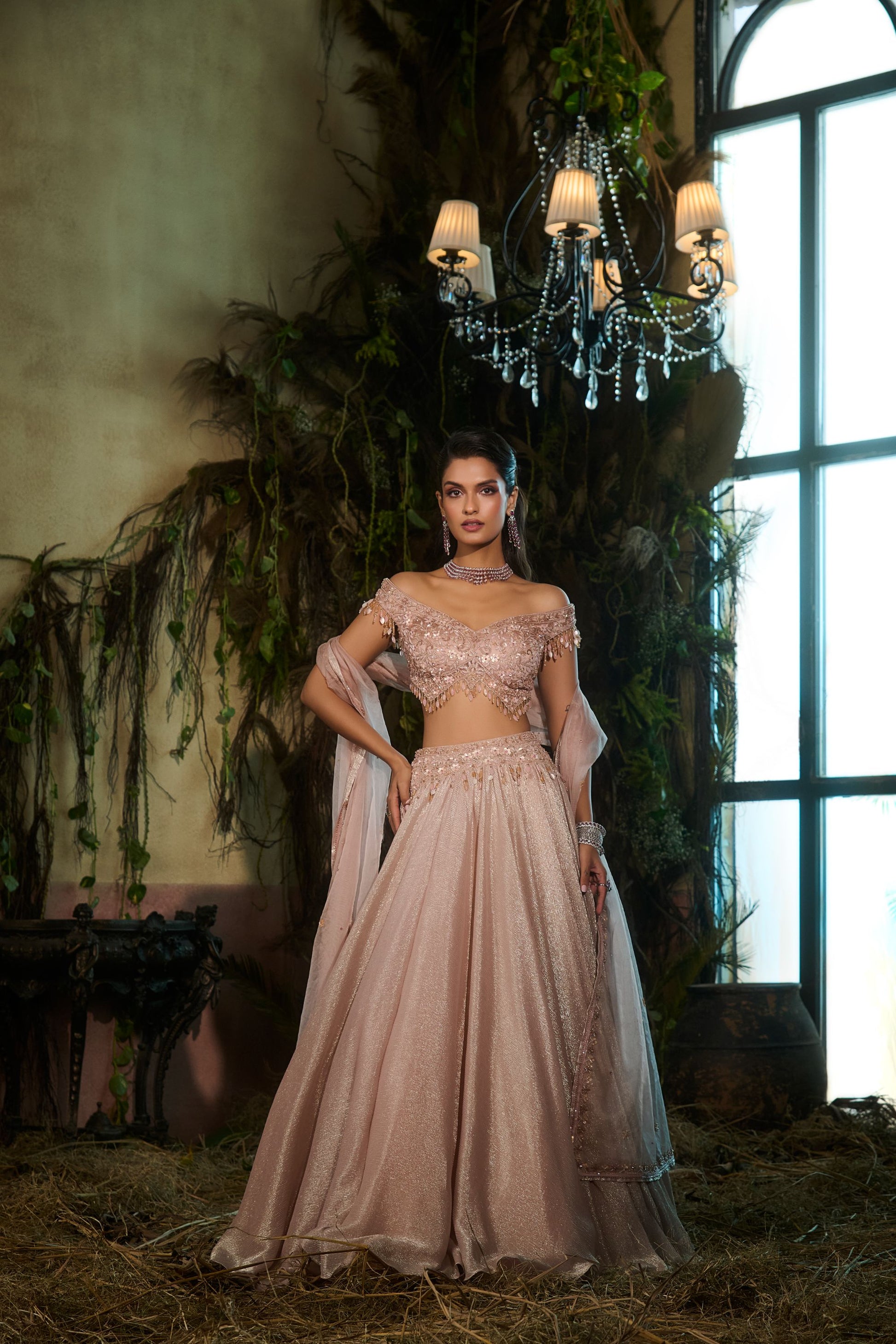Metallic rose pink lehenga paired with crystal & sequins embroidered blouse and organza dupatta.