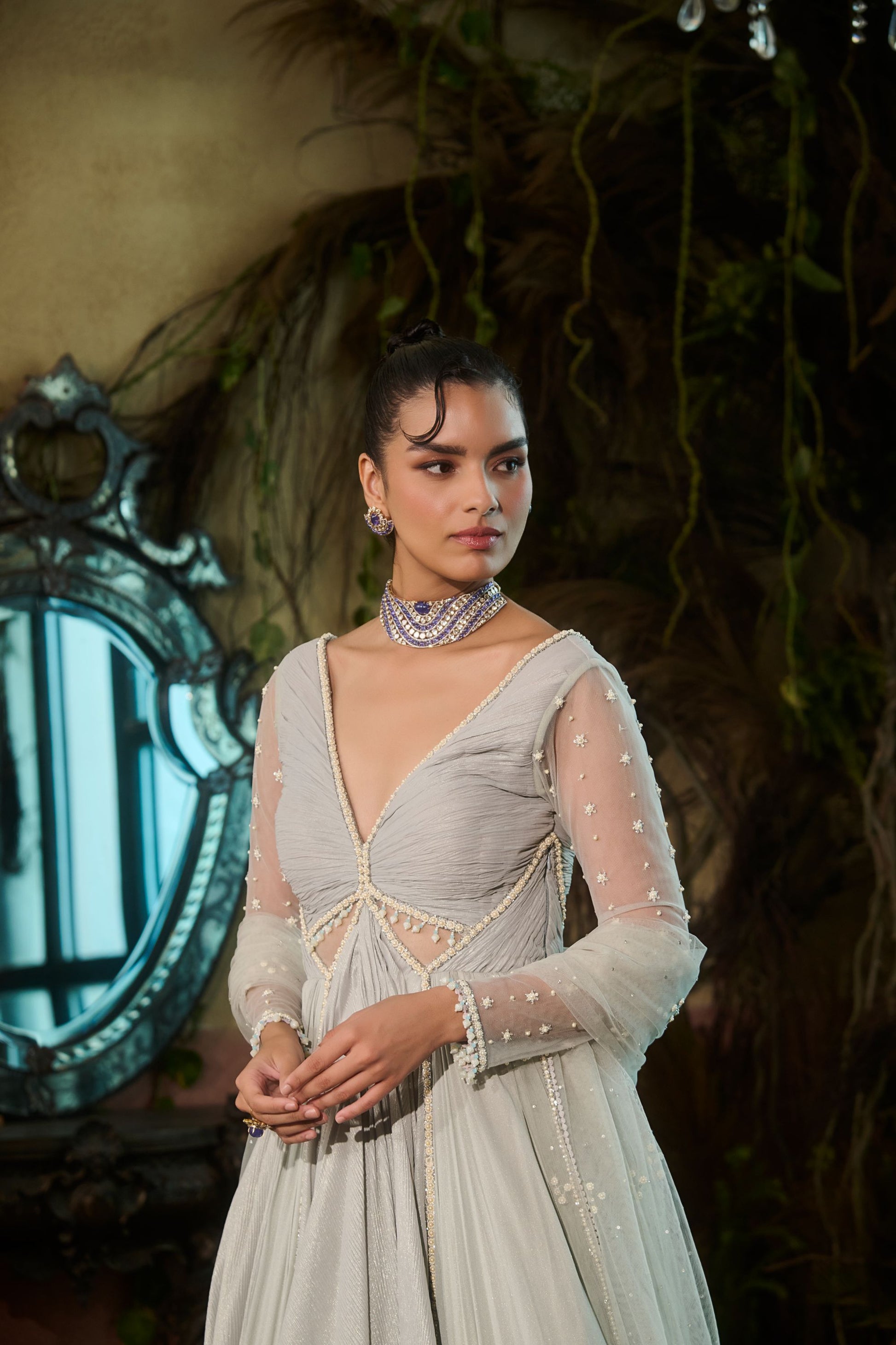 Powder blue metallic Anarkali with fluted bodice and embellished sleeves and dupatta.